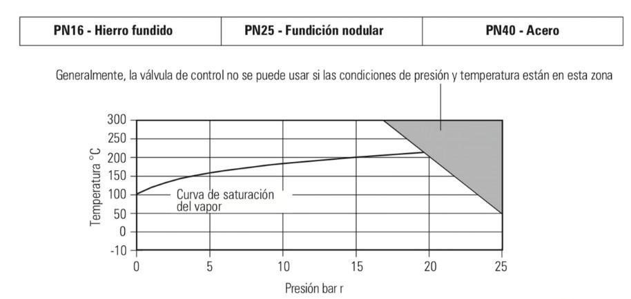 lo que dará como resultado un gráfico típico de presión/temperatura, como se muestra a continuación. Hay que tener en cuenta que el tipo de material utilizado en la fabricación de la válvula de control desempeña un papel importante en el gráfico de Presión/Temperatura.