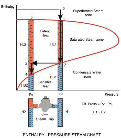 Point 1 represents the energy content of the steam at the entrance of a steam consuming equipment. Latent heat transfer occurs along section 1-2. When point 2 is reached, all the steam has condensed without theoretical variation of its temperature